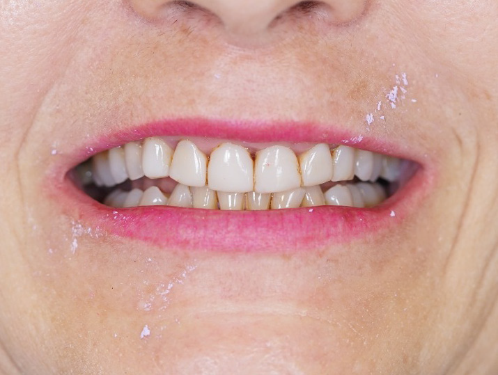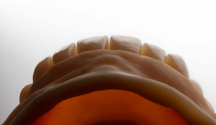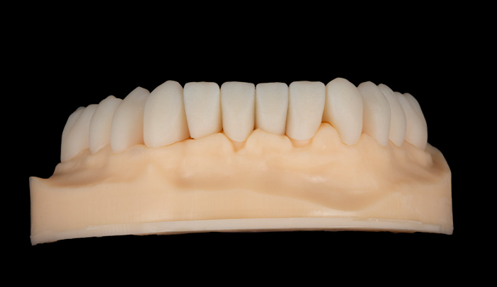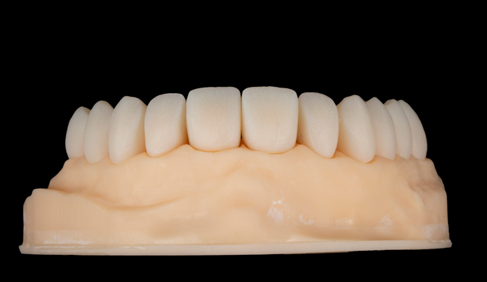 The dentist prepared the teeth from UR6 to UL6 and from LL6 to LR6 for future individual crowns. After having received all collected information, the provisional restorations were made in the form of two bridges. The restorations were joined to facilitate the placement and retention in the clinic. The bridges were made of PMMA (Figures 3 and 4) and were characterised with Optiglaze Color (Figure 5).