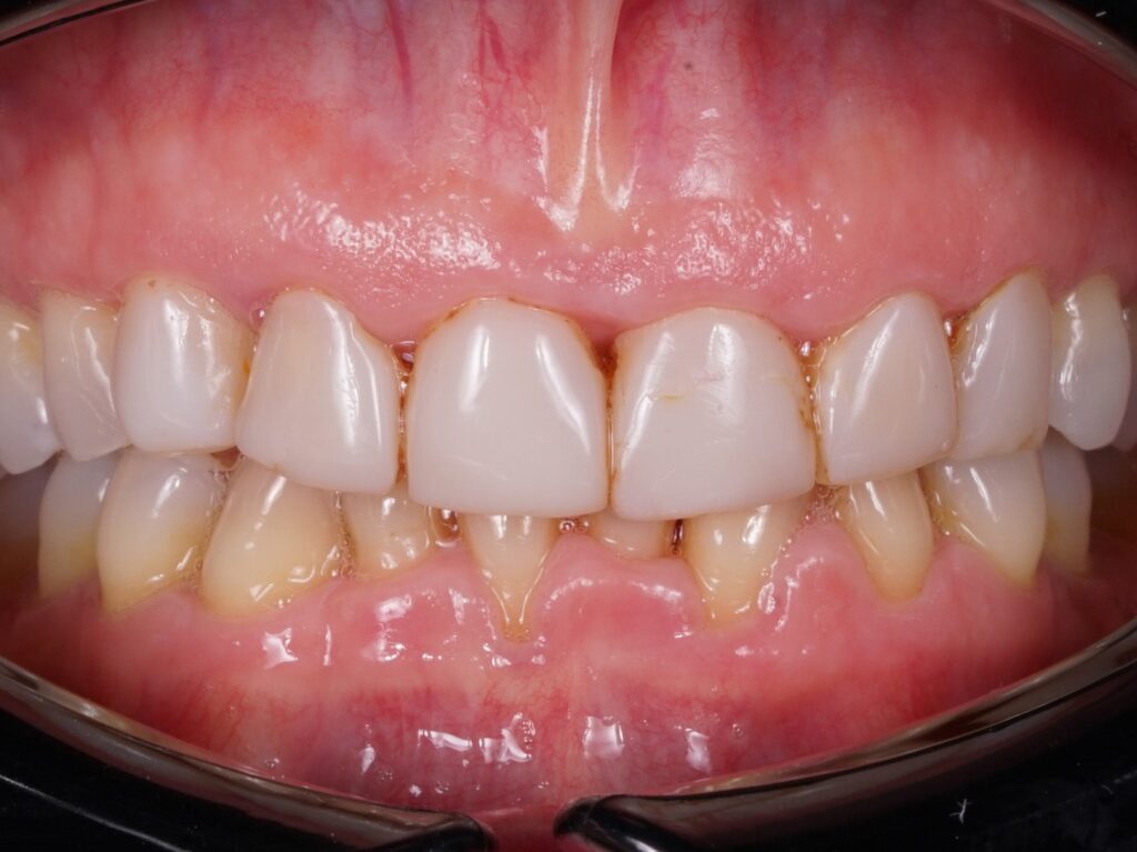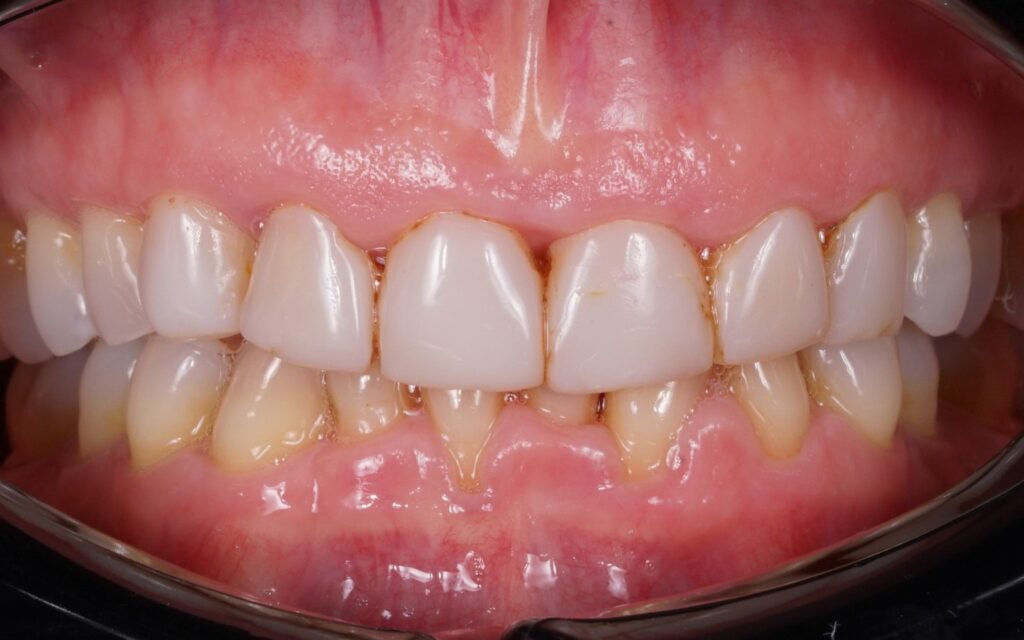 In the cervical zone, Body-B + Enamel E-58 were applied; Translucent TO (Opal Booster) was applied on the mesial and distal edges. Gum Neutral (colourless and absent of additional fluorescence) and Enamel E-58 were applied in the incisal area between those edges, blending the bands. The morphology was created in the wet stage; the ‘Form & Texture Liquid’ gives the ceramic the plasticity to easily model it with a brush. The restorations were finished with Panther rubber polishers (Sirius Ceramics).