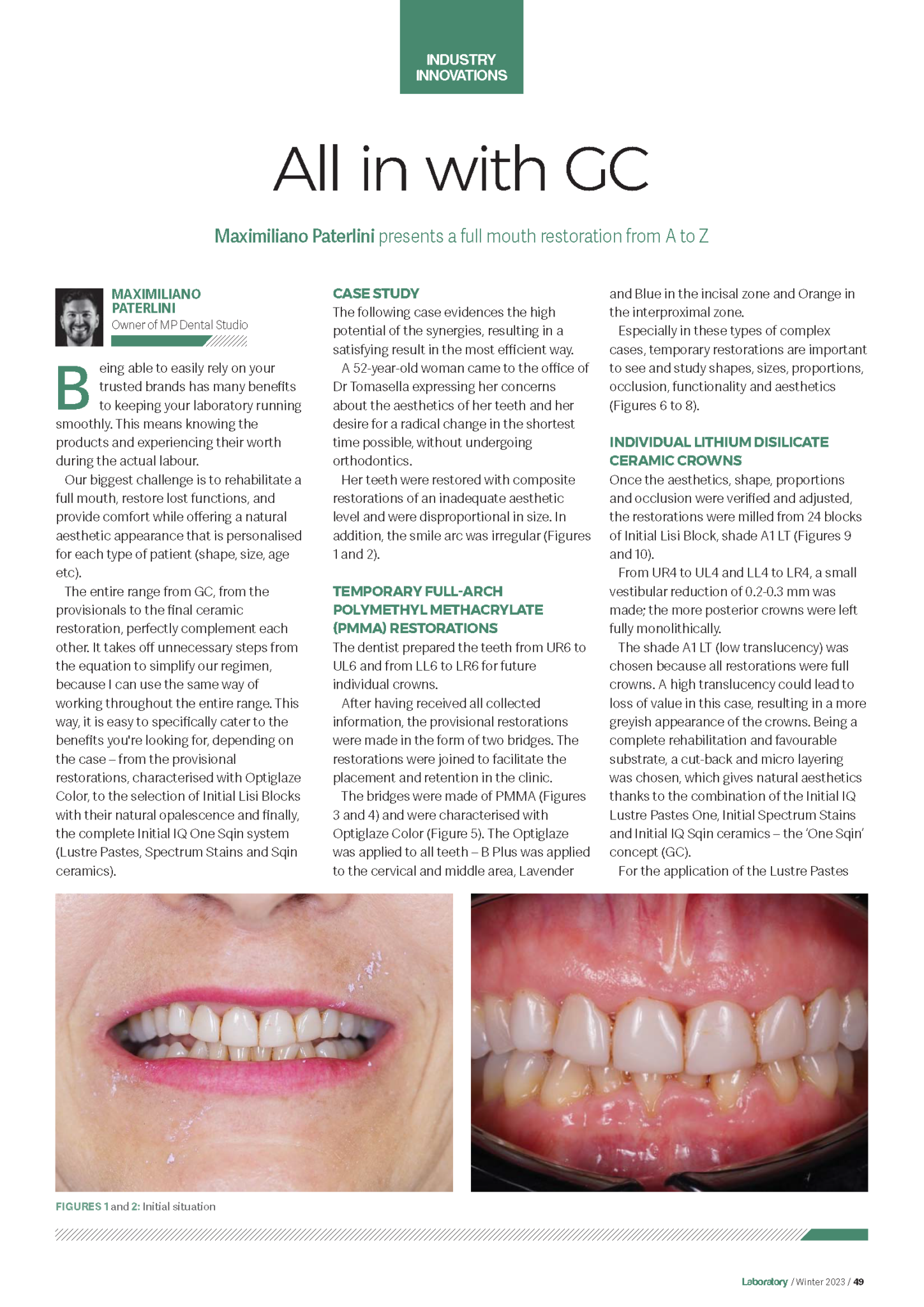 Cervical translucent shade CT-22, Fluo Dentin FD-92, Dentin DA2, CL-F were used for the teeth. Gum shades GM-24, GM-34 and GM-36 were combined with gum universal (GU) to finish the gingiva.