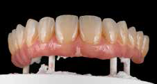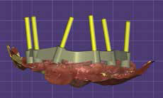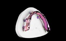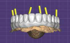 A misfit of the suprastructure can have negative effects, such as detrimental stresses on the bone- titanium junction or prosthetic problems, such as screw loosening. The dentist verified the seating of the aluminium bar, cut and splinted it in the new position for a perfect passive fit (Figure 3) and sent it back to the lab. Then, the analogues were placed and the new position was fixed using a silicone base former and FujiRock Polar White gypsum. This was scanned with scanbodies and overlap meshes in exocad to have the new position of the analogues located in the three-dimensional space of the original design.