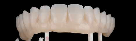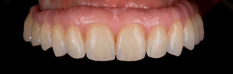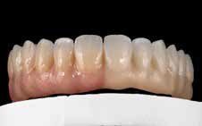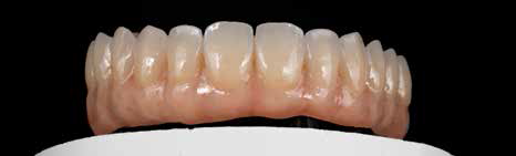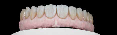 After firing, we already see the beautiful, natural colour and gloss appearing (Figure 11). Further characterisation was done with Initial Zr-FS (Figure 12). These beautiful feldspar-based masses add depth and vitality to the structure. Enamel Opal shades EOP-2 and EOP-3 and E58 were used to mimic the enamel.